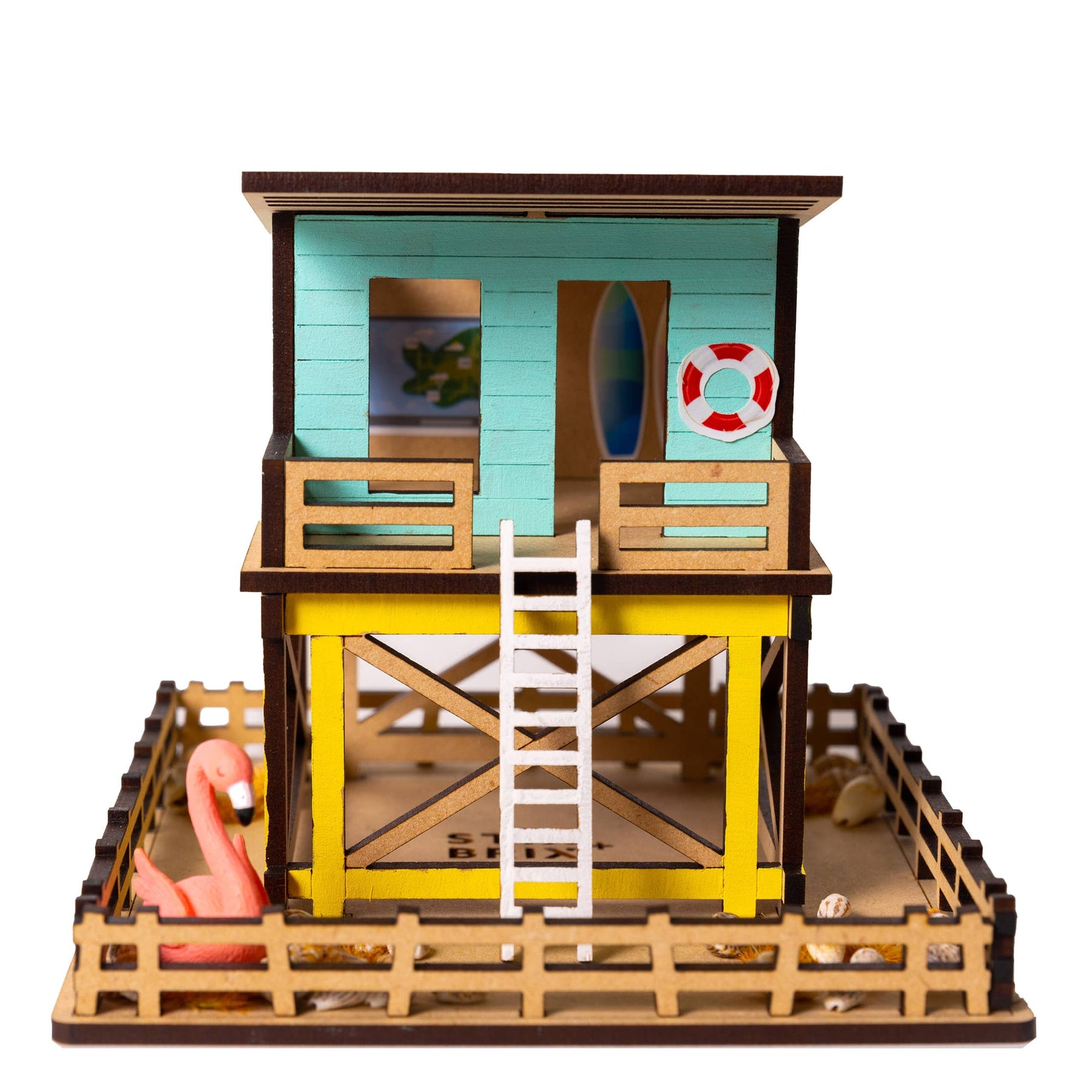 Children will assemble their hut using easy-to-fit wooden pieces, then paint and decorate it to reflect their own sunny vision of life by the shore. With sweet beach details—like tiny shells, grass patches, a cheerful flamingo, and furniture stickers—this kit encourages creativity beyond construction, inviting storytelling long after the building is done.