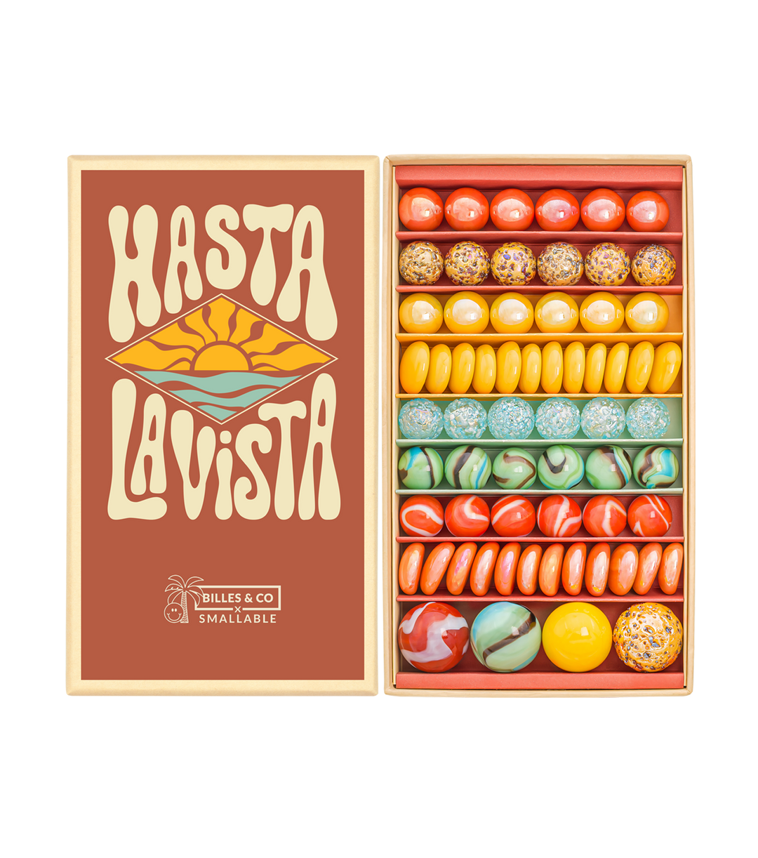 In the United States, marbles used to be offered to children in beautiful boxes, arranged in rows and sorted by marbles type. They were like “treasures of precious stones”. It was a sight to behold. We wanted these boxes for ourselves, right here, right now! So we thought we’d create some boxes to hold the most beautiful marbles. And we thought we’d organize the marbles into “universes”. Why? Because they are in fact like little pieces of the world, “molecules”. They make us dream and think of 1,000 and 1 things: animals, landscapes, stories…