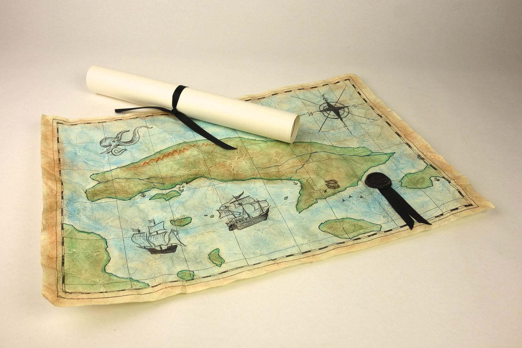 Colored pencils and sharpener included. (2 map templates, sample images, colored pencils, pencil sharpener, 2 skull & cross bones wax seals, ribbon all included.)