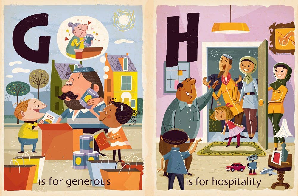 Ramadan is a month-long observance when Muslims all over the world spend more time with each other, emphasize charitable works, fast, pray, and break their daily fast each night together. It’s a time meant to focus on things such as sharing, empathy, compassion, generosity, and selflessness. These ideals are wonderfully illustrated here in Greg Paprocki’s inimitable style for each of the 26 letters of the alphabet.