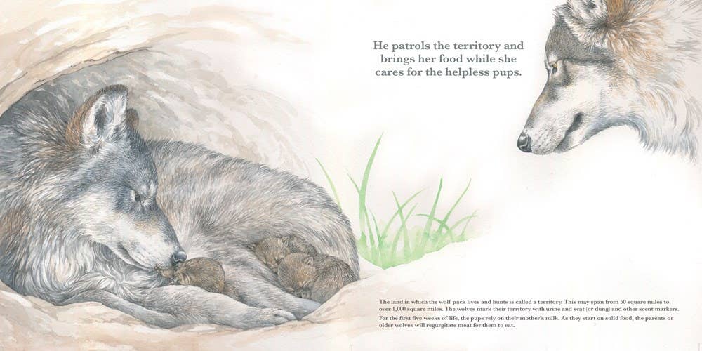 They are the leaders. The creators of the pack. She digs the den, where their young will grow. He patrols the territory and brings her food while she cares for the helpless pups. As seasons pass, and new litters arrive, the pack grows and all work together to raise the young. A wolf’s piercing howl can carry up to 10 miles, raising goosebumps on even the most intrepid camper’s skin. But the gray wolf is far from a simple predator. An incredible combination of teamwork and instinct has helped wolf packs survive, despite being endangered in most of North America. With a mother wolf and father wolf leading the pack–their family–together, the cubs grow and learn the skills they need to start their own pack someday. With stunning, lifelike illustrations and facts on each page for grownups or older children who want a deeper dive, this beautiful picture book is a monument to these majestic packs.