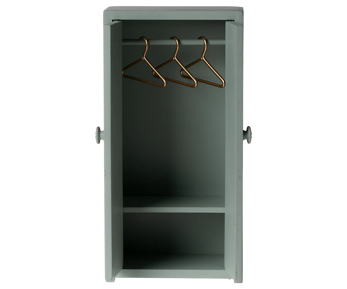 A small closet helps the mice family organize their wardrobe. The closet comes with three golden hangers.