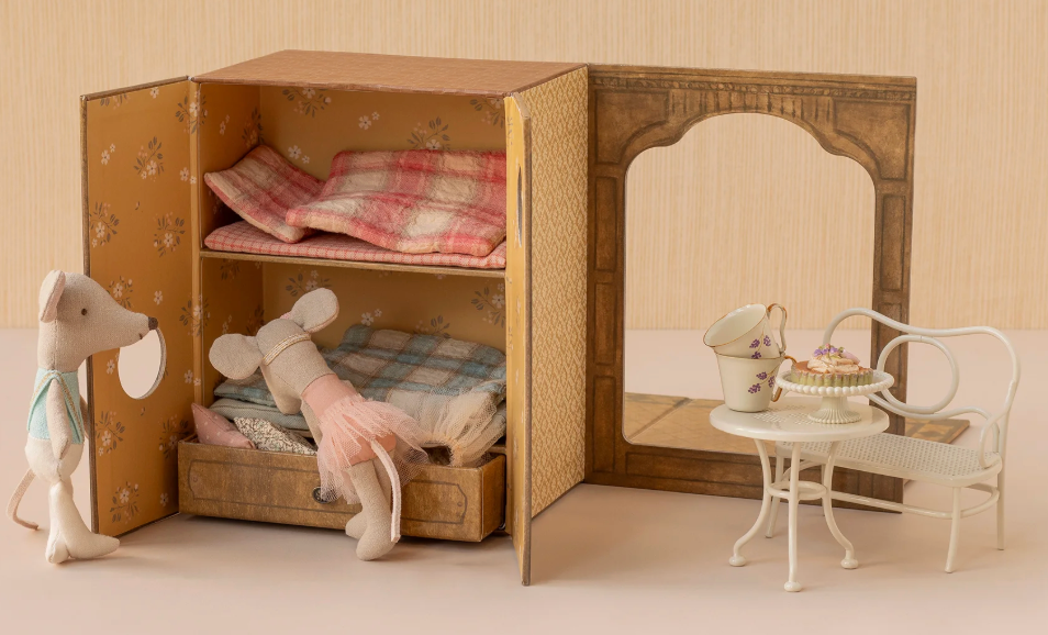 Open the doors of this magical playset and explore a world of dance, stardust and storytelling. This enchanting set transforms from a cosy mouse house to a ballet studio where dreams take centre stage. The mirrored wall glimmers while the magnetic barre holds fast to every tiny paw as the mice rehearse their grand performance. Two ballet mice, already dressed for the spotlight, wait eagerly in their beds, ready to twirl and tell their stories on stage.