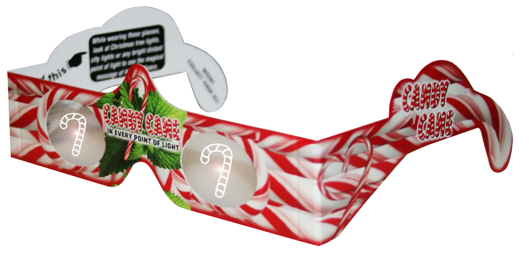 Our holographic "Candy Cane"lenses bend light creating a magical candy-cane image on each bright point of light, providing an optical experience like you've never seen before!